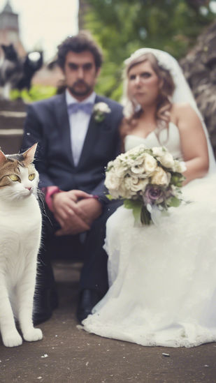 "Our wedding photoshoot unexpectedly saved our nearly lost marriage. The punk cat's playful spirit lightened the day and reminded us to enjoy ourselves. As we laughed, we rekindled a connection that had been missing. We're grateful for this service and the joy the punk cat brought!"
